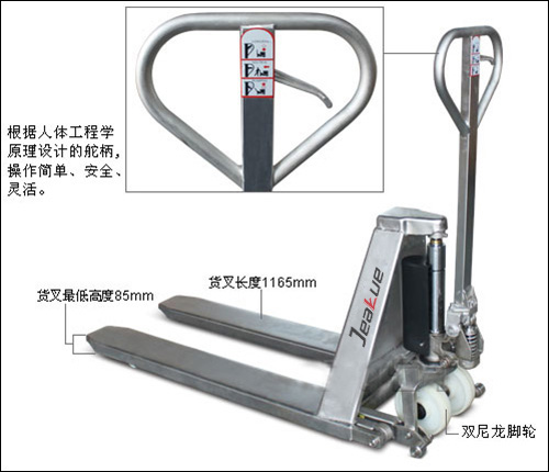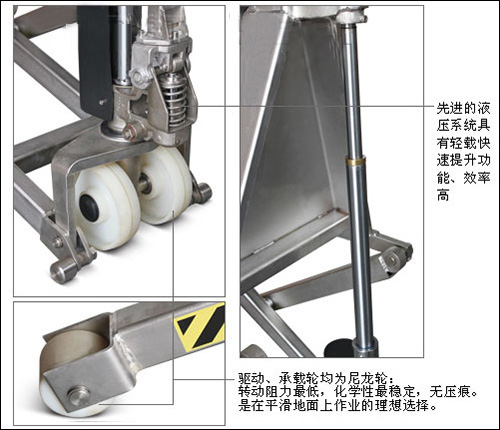 ? 所有零部件材質(zhì)都為不銹鋼,包括液壓泵,貨叉框架,手柄,推桿,軸承,銷和螺栓,等等;