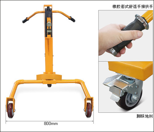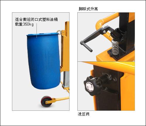 ? 通過一個特制的千斤頂輕松的起升,2個8寸前大輪和一個4寸的萬向輪操作靈活,起升時夾鉗有自動抓取和鎖緊的功能,放下油桶會自動打開;