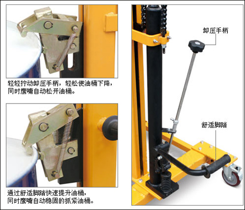 ? 起升高度較高,適用于對小型卡車上的油桶進(jìn)行裝卸及搬運(yùn)操作;