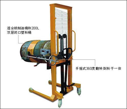 ·適合鋼制油桶和200L雙層閉口塑料桶的搬運(yùn)、堆高、360度翻轉(zhuǎn)倒料于一體;
