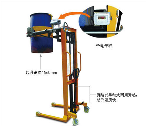 ·帶電子秤稱重式液壓油桶搬運(yùn)裝卸倒料車,有置零、 去皮、稱重功能,精確度可達(dá)到±100克;
