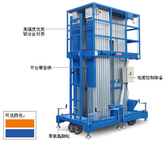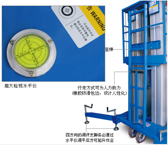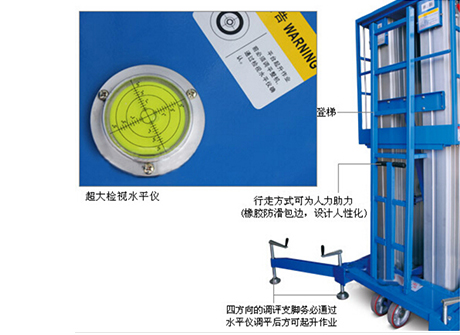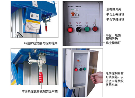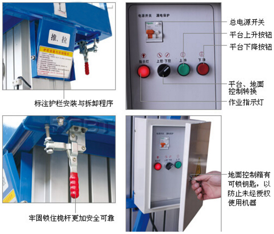 ? 平臺控制:平臺上標有操作動作標示圖,易于理解操作。地面也可控制設備的升降 ;