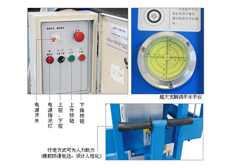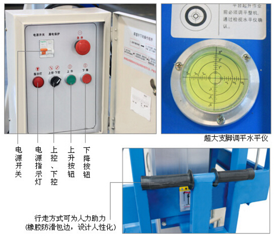 ? 平臺控制:平臺上標(biāo)有操作動作標(biāo)示圖,易于操作。地面也可控制設(shè)備的升降;