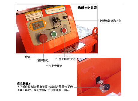 ? 平臺(tái)控制:平臺(tái)上標(biāo)有操作動(dòng)作標(biāo)示圖,易于操作。地面也可控制設(shè)備的升降;