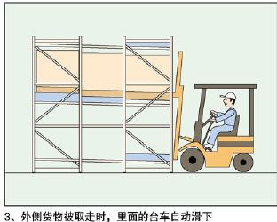 壓入式貨架是在前后梁之間以多層臺(tái)車重疊相接,從外側(cè)將托盤(或料箱)置入臺(tái)車推入,后儲(chǔ)存之貨物會(huì)將原先的貨物推向里面。臺(tái)車跨于傾斜軌道上,當(dāng)外側(cè)貨物被取走時(shí),里面的會(huì)自動(dòng)滑下。壓入式貨架儲(chǔ)存量大,空間利用率高,適合少品種、大批量之貨物,先進(jìn)后出之作業(yè)方式,進(jìn)貨和出貨在同一側(cè)面。