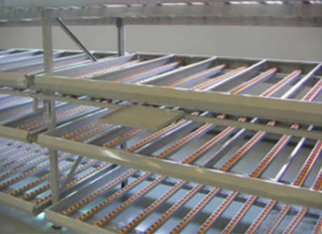 流力式貨架又稱自滑式貨架,基本結(jié)構(gòu)和原理與重力式貨架相同,在橫梁上設(shè)置滾輪式鋁合金或鈑金流利條,呈一定的坡度放置。存放的貨物為小件物品,存取方式為人工作業(yè),貨物通常以紙箱包裝或?qū)⒇浳锓湃胨芰现苻D(zhuǎn)箱、零件盒內(nèi)。利用自重實現(xiàn)貨物的流動和先進(jìn)先出,并可實現(xiàn)一次補貨,多次揀貨,存儲效率高;多用于配送中心揀選作業(yè)和生產(chǎn)裝配線兩側(cè)工序轉(zhuǎn)換等場所,可配以電子標(biāo)簽實現(xiàn)貨物的信息化管理。
