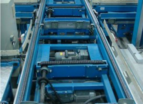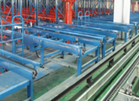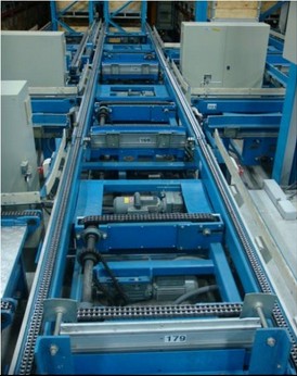 鏈?zhǔn)捷斔蜋C(jī)一般做為立體倉(cāng)庫(kù)中托盤縱向輸送設(shè)備,主要用于立體倉(cāng)庫(kù)中堆垛機(jī)存取托盤的過(guò)渡輸送或用于出入庫(kù)口與穿梭小車之間的托盤輸送。由兩條按一定距離固定在金屬板上的套筒滾子鏈和軌道支架、導(dǎo)向裝置、驅(qū)動(dòng)裝置、張緊裝置等組成,是出入庫(kù)系統(tǒng)中常用設(shè)備之一。