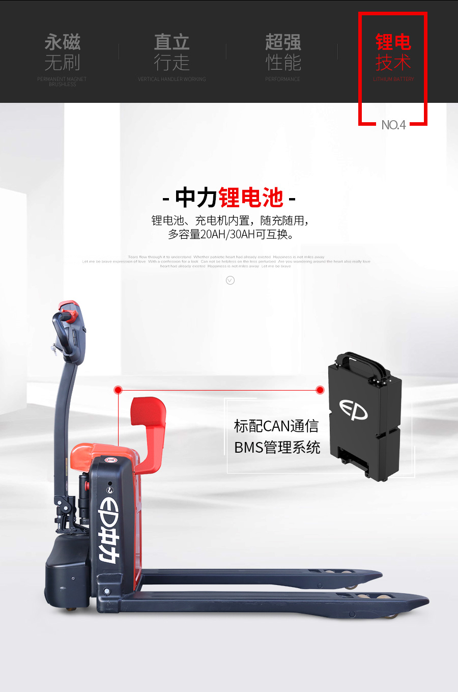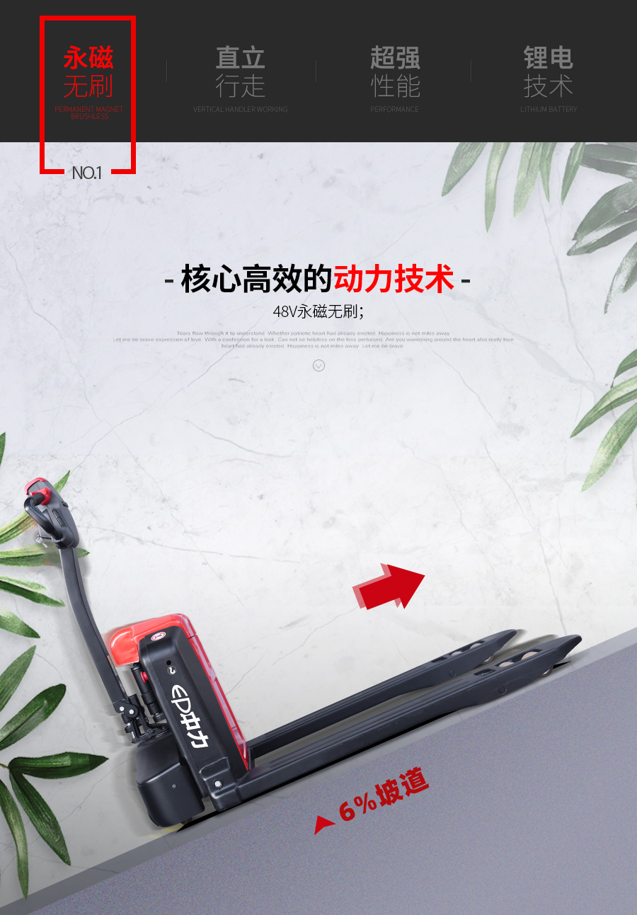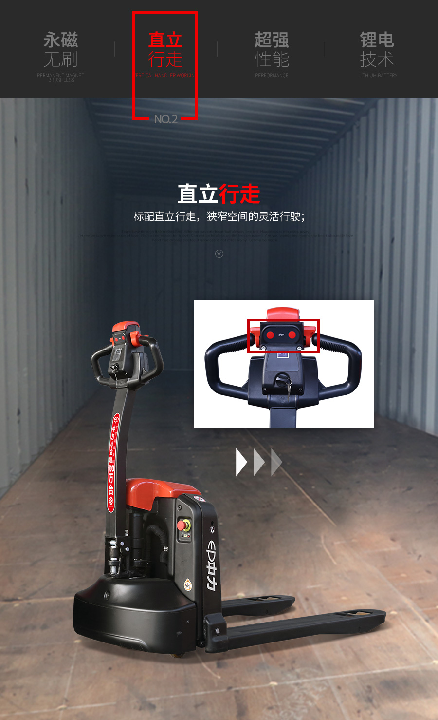 2噸大載荷,內(nèi)置充電器可快速插拔電池,滿足多種使用要求 :