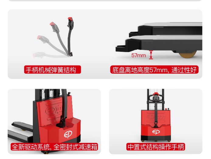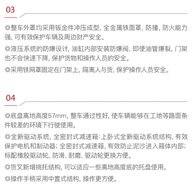 工地車底盤離地高度57mm,整車通過(guò)性好; 貨叉挑托結(jié)構(gòu)設(shè)計(jì),可適應(yīng)離地高度底的托盤 :