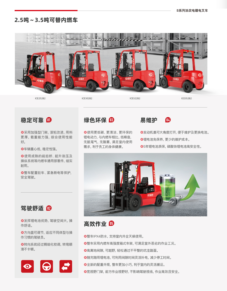ICE252B2/302B2/322B2/352B2 2.5/3.0/3.2/3.5噸鋰電平衡重叉車 B系列油改電