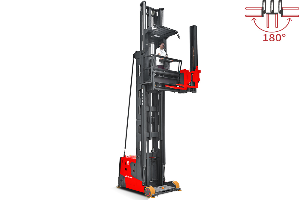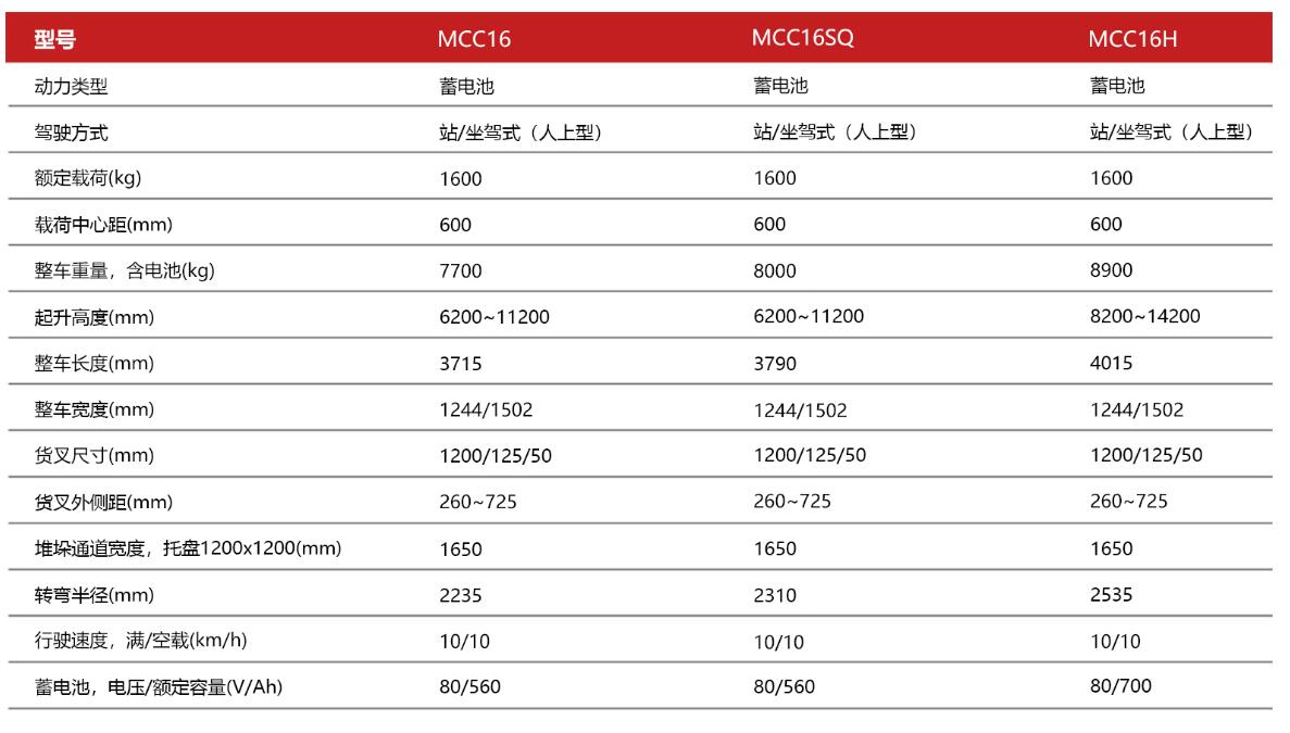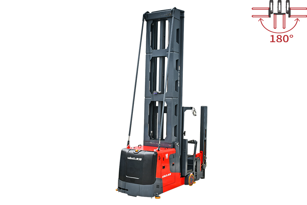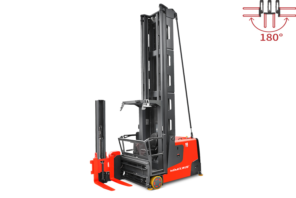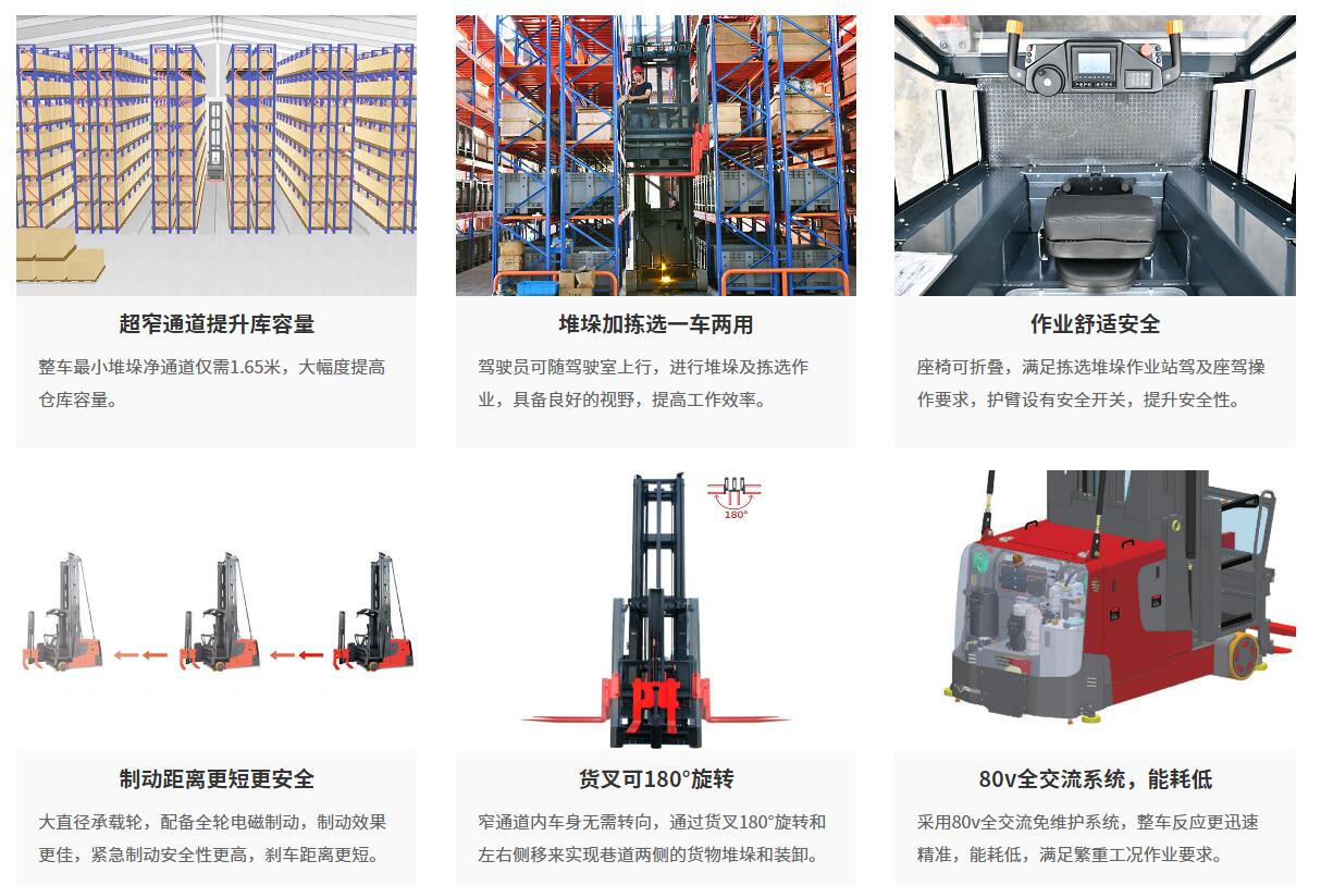 MCC16系列叉車是一款人上型窄巷道三向堆式叉車,額定載荷1.6噸,主起升高度4.5-12.5m,副起升1.7m,車身無需 轉向,通過貨叉180°旋轉和左右側移來實現(xiàn)巷道兩側的貨 物堆垛和裝卸。駕駛室可起升,進行高位揀選、盤點等作 業(yè),具有站駕及坐駕兩種操作方式,具備良好的作業(yè)視野。 :