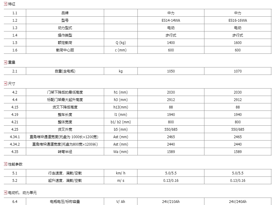 ES12-12WA/ES14-14WA/ES16-16WA 1.2/1.4/1.6噸電動堆高車