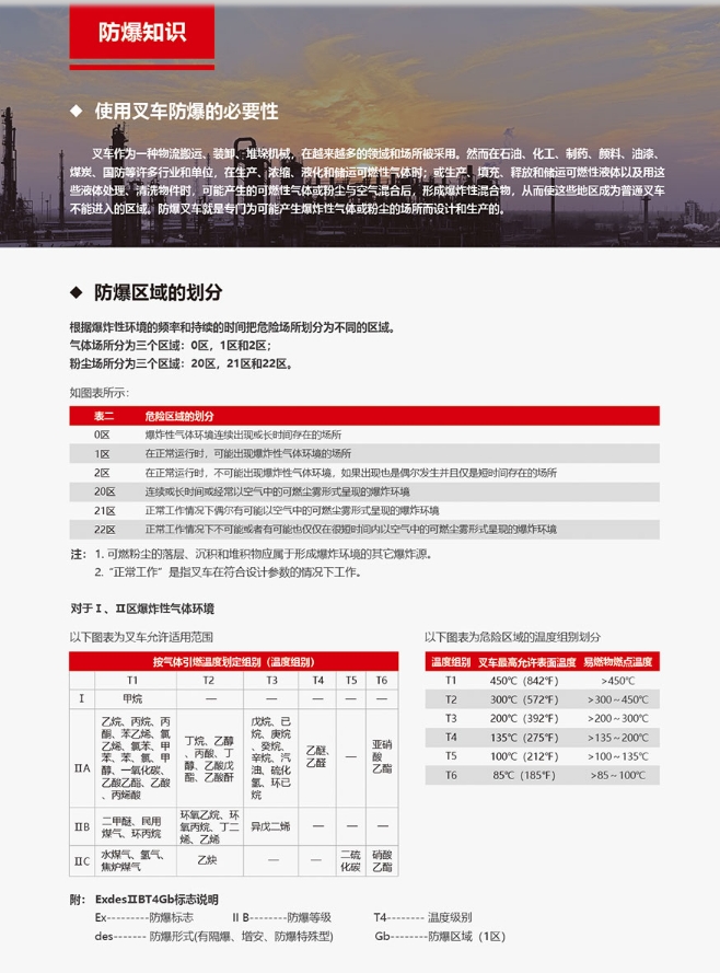 防爆標(biāo)志為Ex de ib ⅡB T4 Gb /Ex tD ibD A21 IP65 T135℃。適合爆炸性氣體環(huán)境(1、2區(qū))及非導(dǎo)電性粉塵環(huán)境(21、22區(qū))等高防爆要求場(chǎng)合使用,如石化、軍工、制藥、油漆、煤化、粉體、酒廠等行業(yè)的爆炸性環(huán)境的生產(chǎn)、倉(cāng)庫(kù)等場(chǎng)所的搬運(yùn)裝卸作業(yè); :