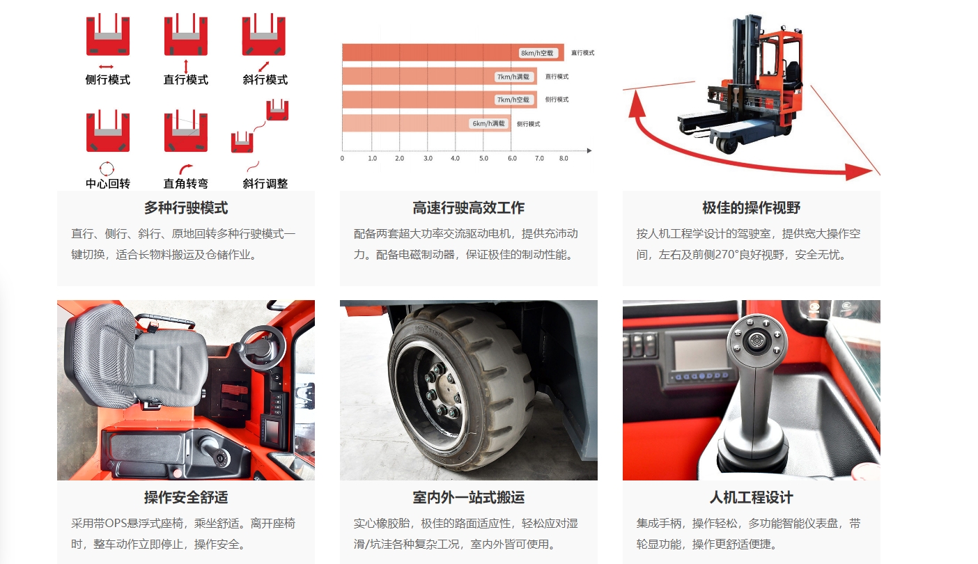 MQC45/50多向前移式叉車(chē),承載能力4.5/5.0噸,門(mén)架可以整體前移或縮回,配置有加寬調(diào)距貨叉,四輪轉(zhuǎn)向獨(dú)立控制,可以直行、側(cè)行、斜行、原地回轉(zhuǎn);側(cè)行時(shí)擁有較小的通道,特別適用于長(zhǎng)物料的工況。 :