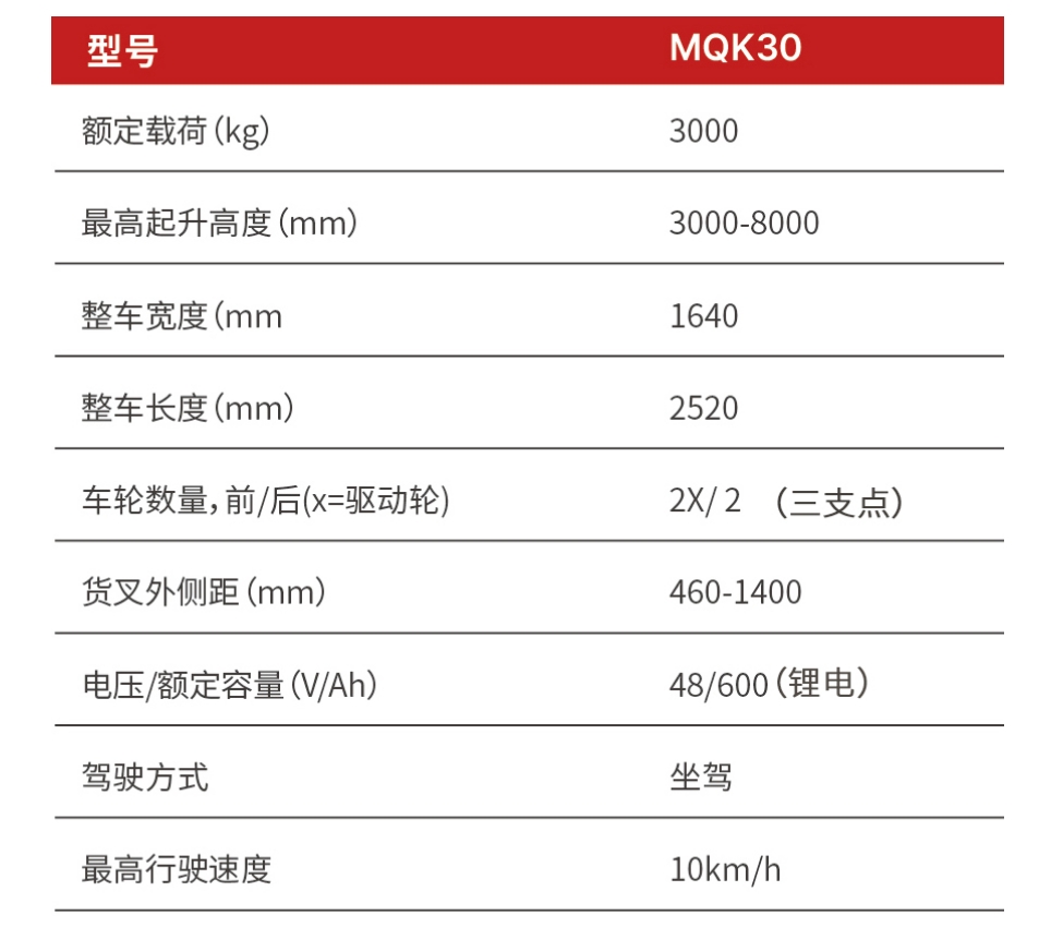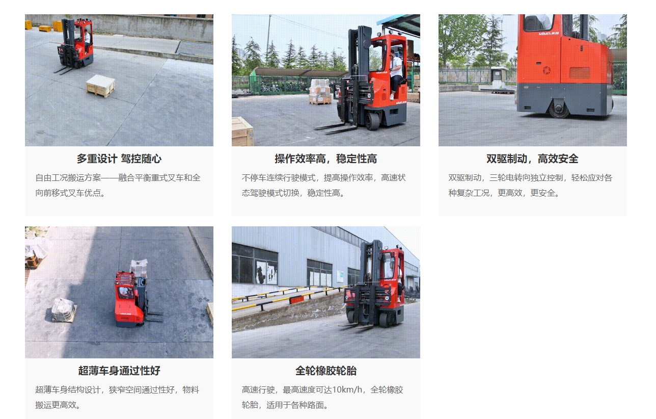 MQK30全向平衡重叉車額定載荷3000kg,最大起升高度可至8米,可直行、側(cè)行、斜行及原地回轉(zhuǎn),具備極高的行駛靈活性。同時采用全電轉(zhuǎn)向,可完全適配無人化又車的改制。 :